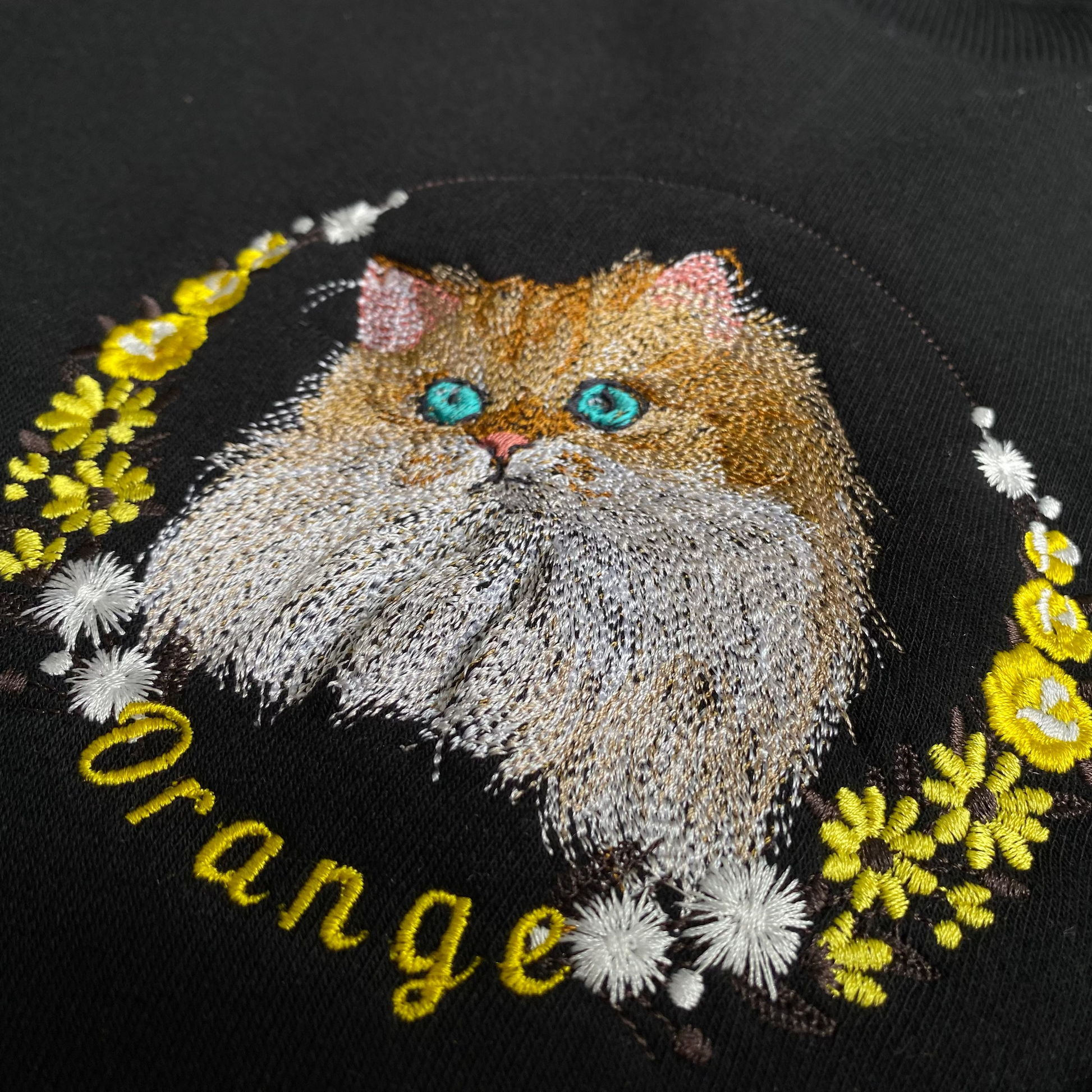 Mẫu thêu áo sweater thú cưng phối hoa chuyển thể từ ảnh trên áo nỉ đen, tặng hai hình thêu trên tay áo (Copy)