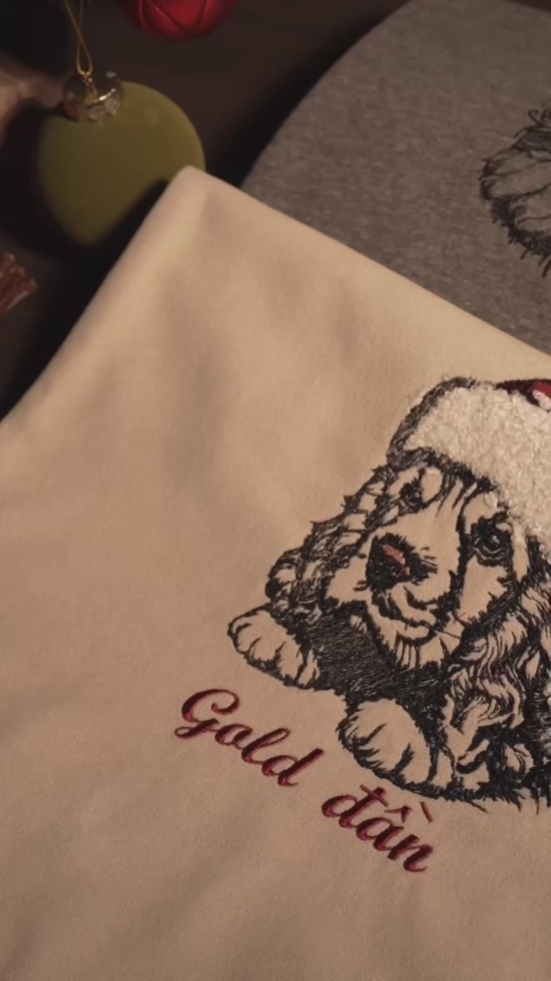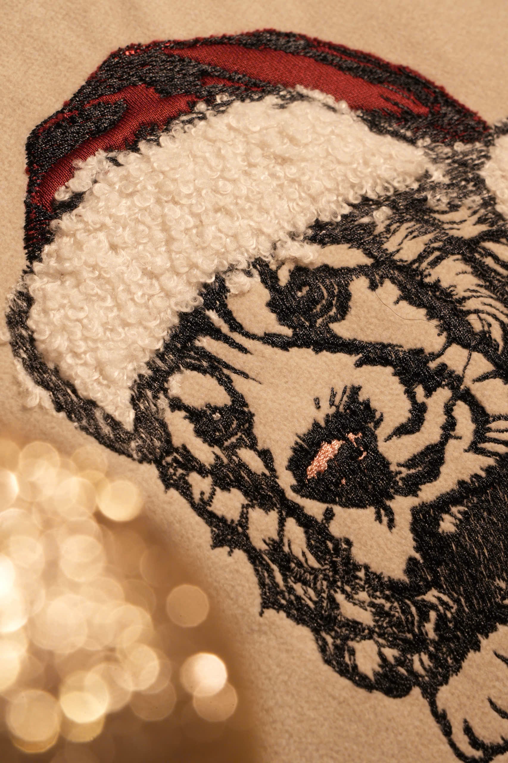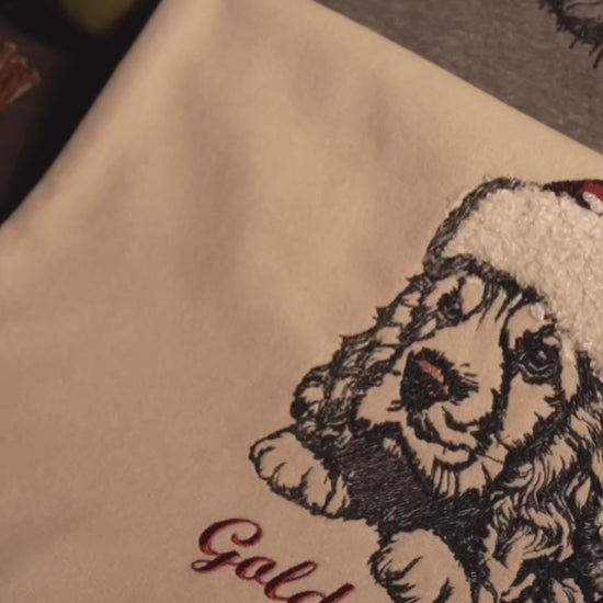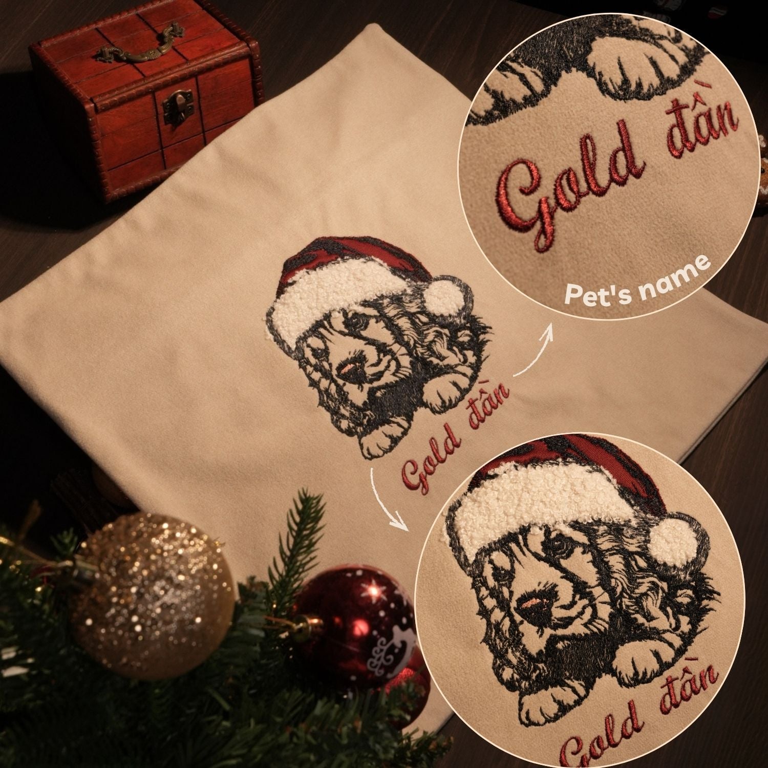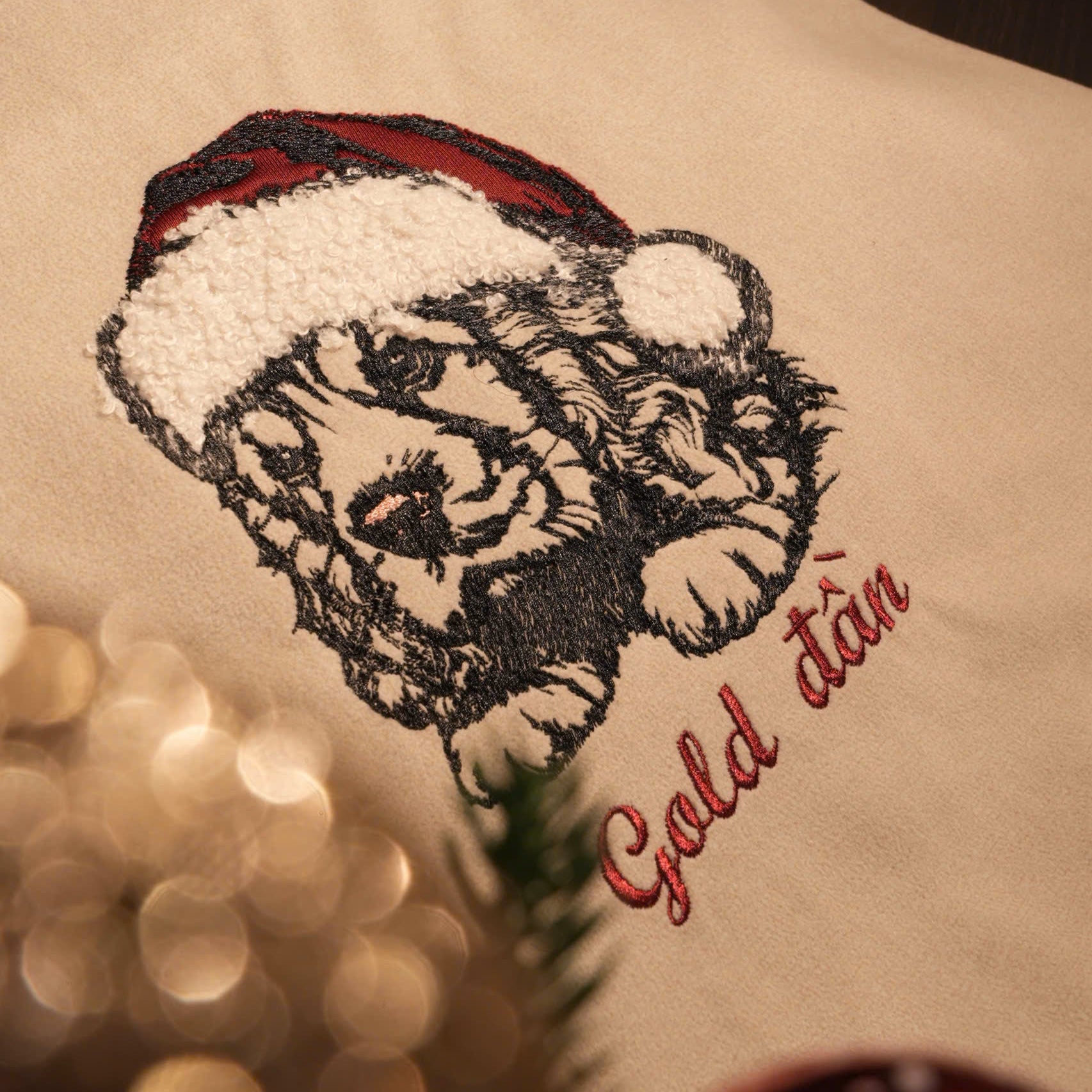 Mẫu thêu cún yêu giáng sinh chuyển thể từ ảnh phong cách line art trên vỏ gối kích thước 45x45cm, kèm tên cún
