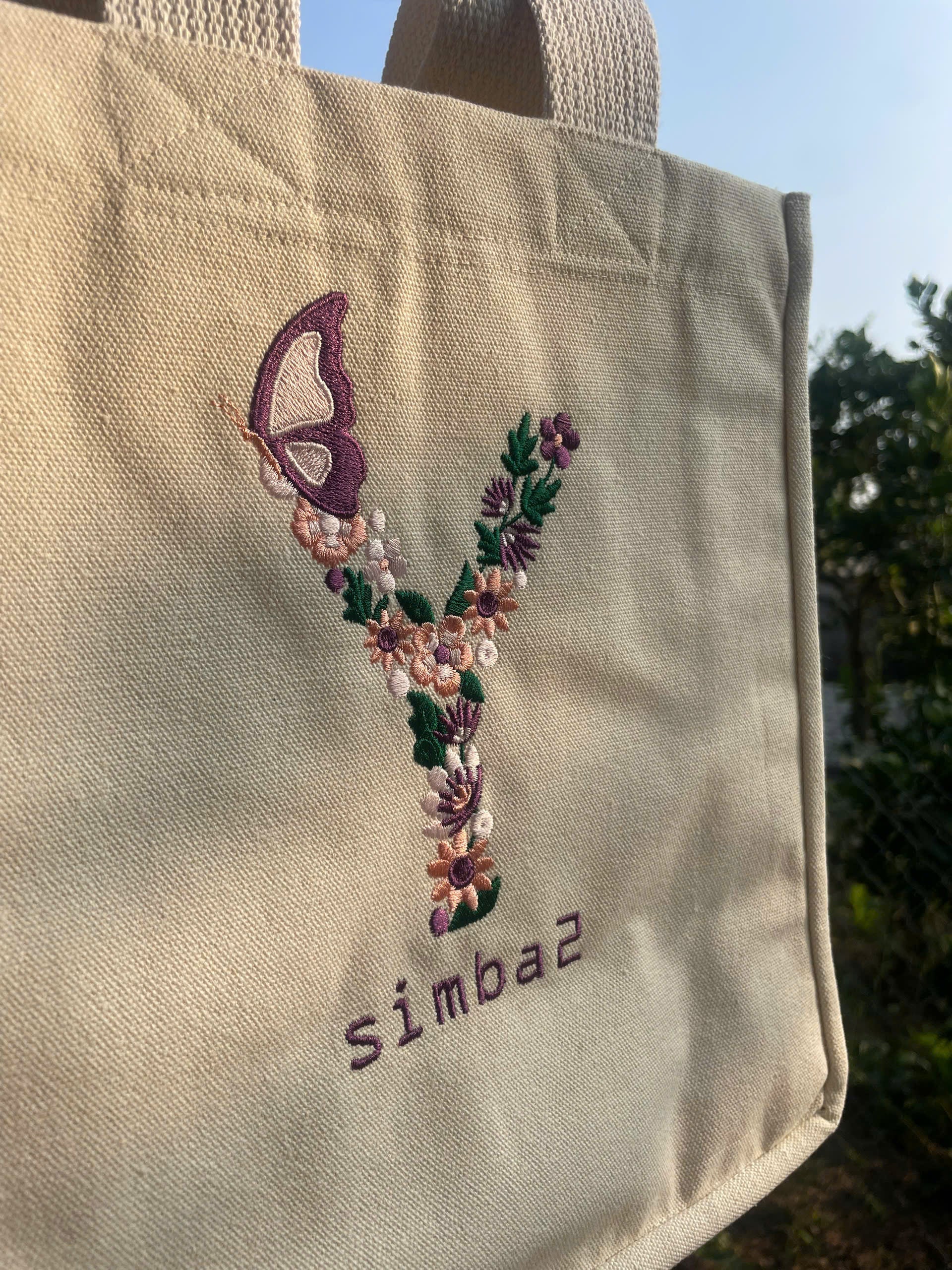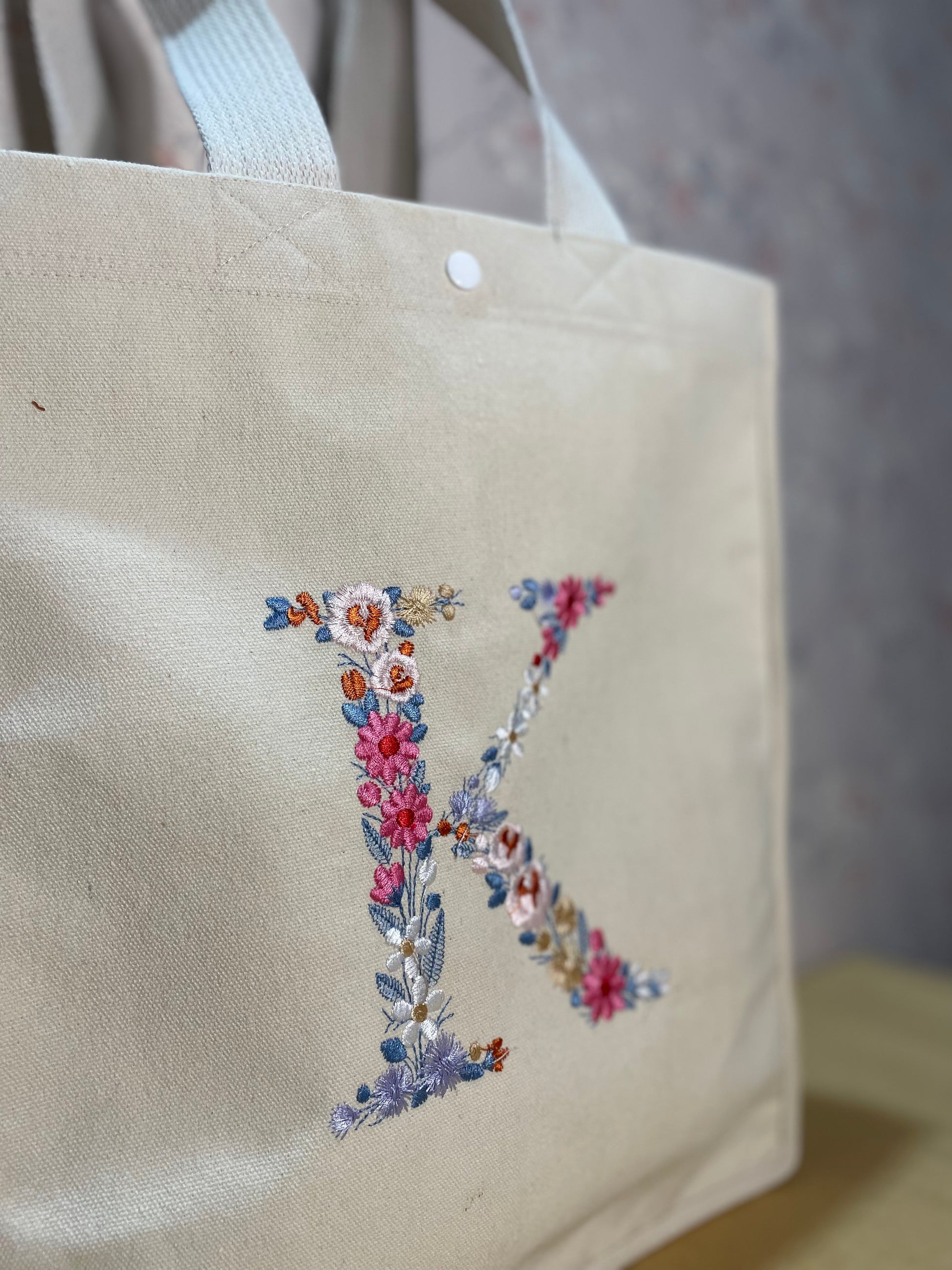 Tote thêu tên riêng phối hoa kích cỡ theo yêu cầu 1 chữ cái